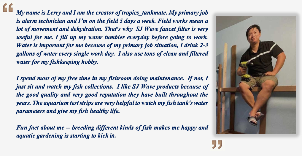 For his hobby, Lerry only depends on SJ Wave’s Aquarium and Ammonia Test Strips to keep his aquarium water. These products let you keep track of the quality of your aquarium water to ensure a safe haven for your aquatic pets; and are perfect for fishkeepers or aquarium hobbyists like Lerry; and for aquarists on a more professional level.